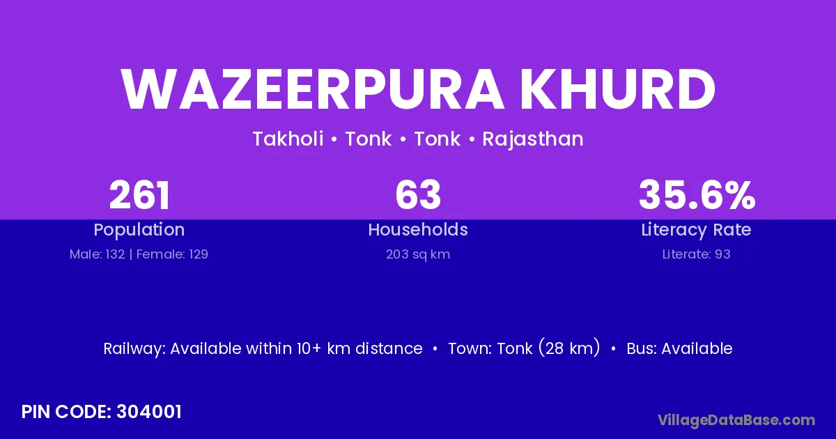 Tonk (28 km) is the nearest town to Wazeerpura Khurd village for major economic activities and is located approximately 28 km away.