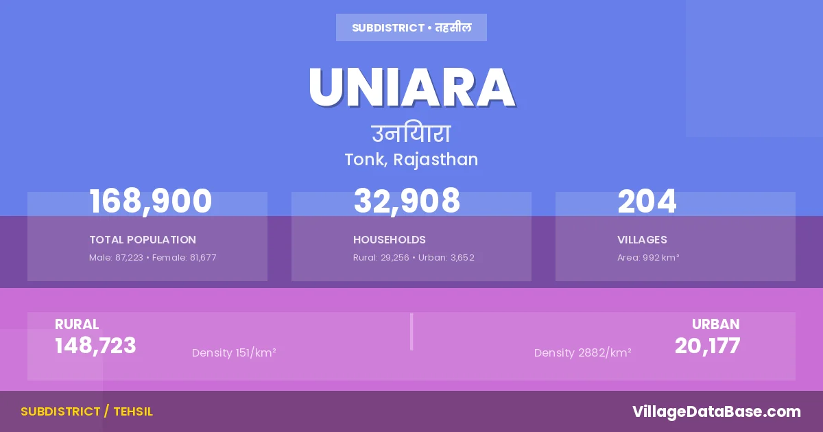 According to the 2011 census The total area of Uniara Tehsil is 992 km², with a population of 168900 people. The population density is 170 inhabitants per square kilometre, and there are approximately 32908 houses in the sub district.