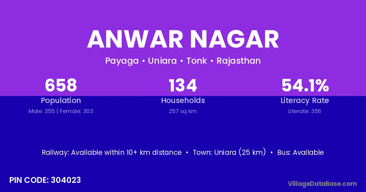 Anwar Nagar village has a total population of 658 people, of which 355 are males and 303 are females.