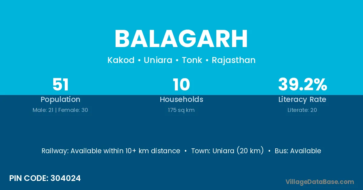 Balagarh village has a total population of 51 people, of which 21 are males and 30 are females.