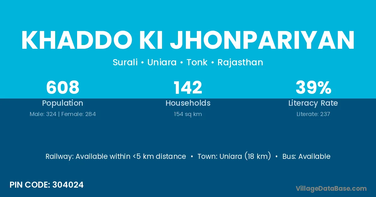 Uniara (18 km) is the nearest town to Khaddo Ki Jhonpariyan village for major economic activities and is located approximately 18 km away.