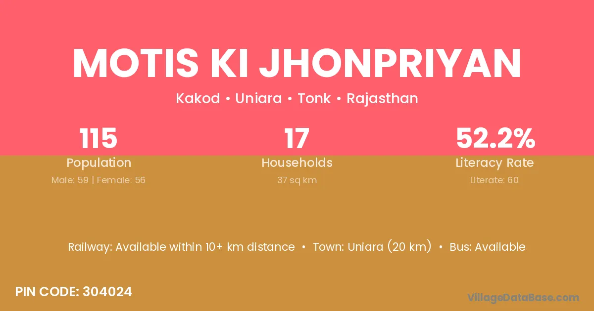 Motis Ki Jhonpriyan village has a total population of 115 people, of which 59 are males and 56 are females.