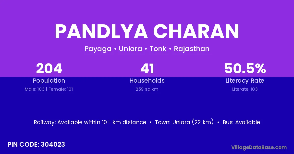 Pandlya Charan village has a total population of 204 people, of which 103 are males and 101 are females.
