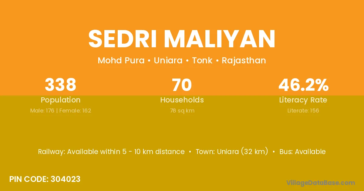Uniara (32 km) is the nearest town to Sedri Maliyan village for major economic activities and is located approximately 32 km away.