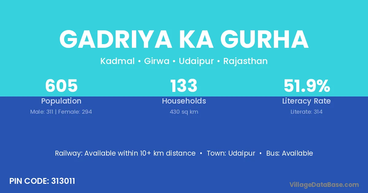 Gadriya Ka Gurha village has a total population of 605 people, of which 311 are males and 294 are females.