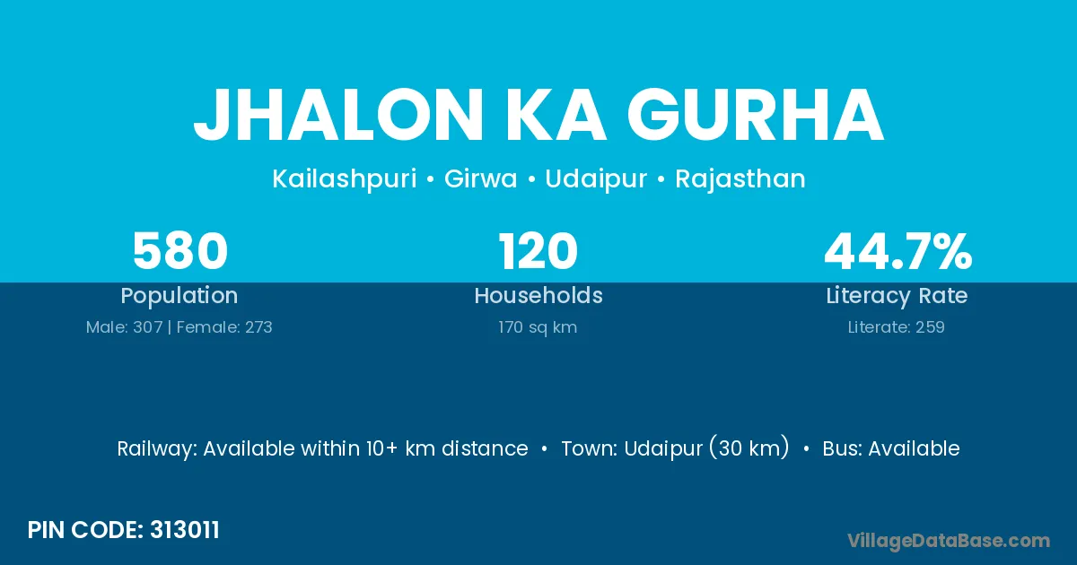 Udaipur (30 km) is the nearest town to Jhalon Ka Gurha village for major economic activities and is located approximately 30 km away.