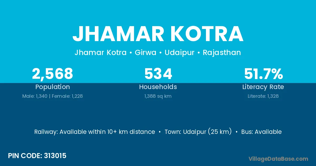 Udaipur (25 km) is the nearest town to Jhamar Kotra village for major economic activities and is located approximately 25 km away.
