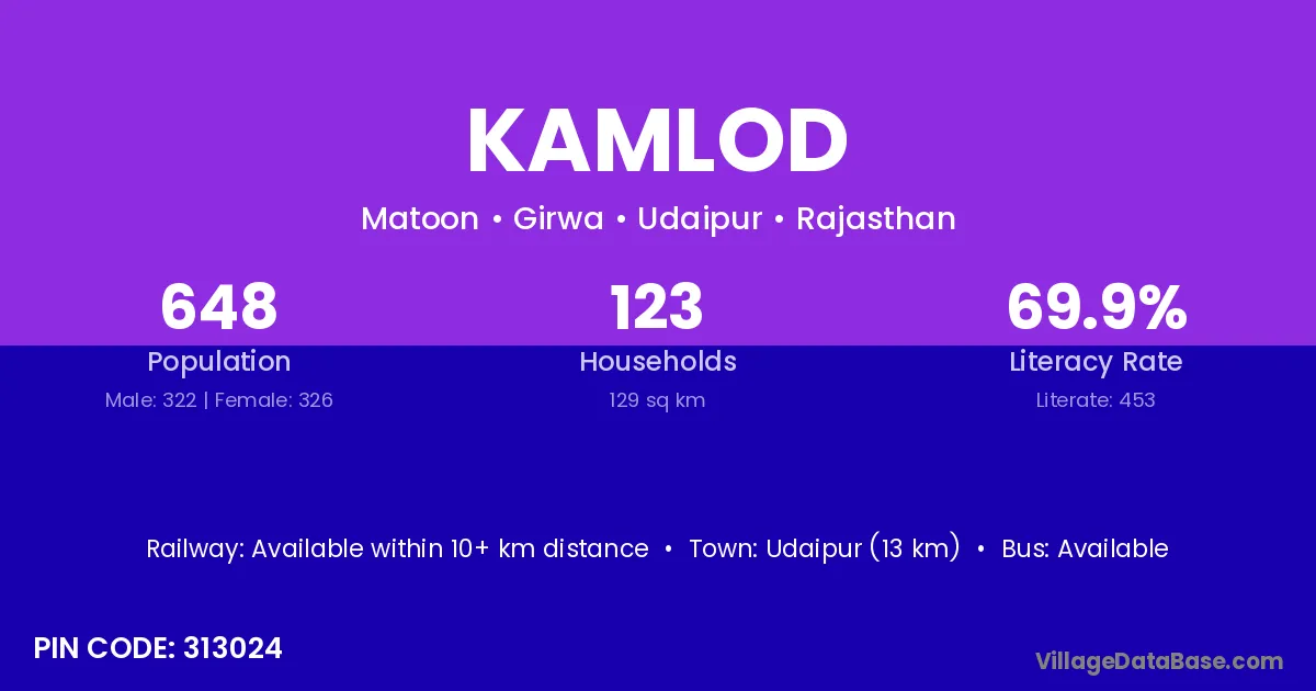 Udaipur (13 km) is the nearest town to Kamlod village for major economic activities and is located approximately 13 km away.