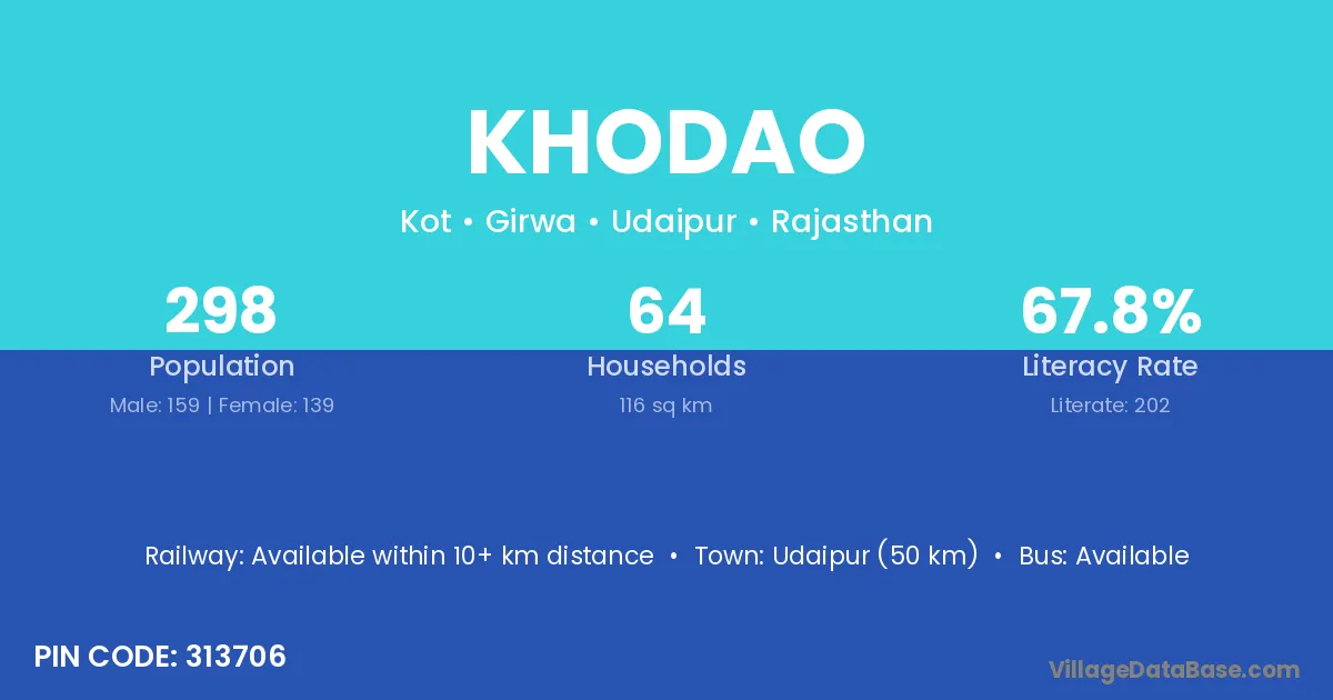 Udaipur (50 km) is the nearest town to Khodao village for major economic activities and is located approximately 50 km away.