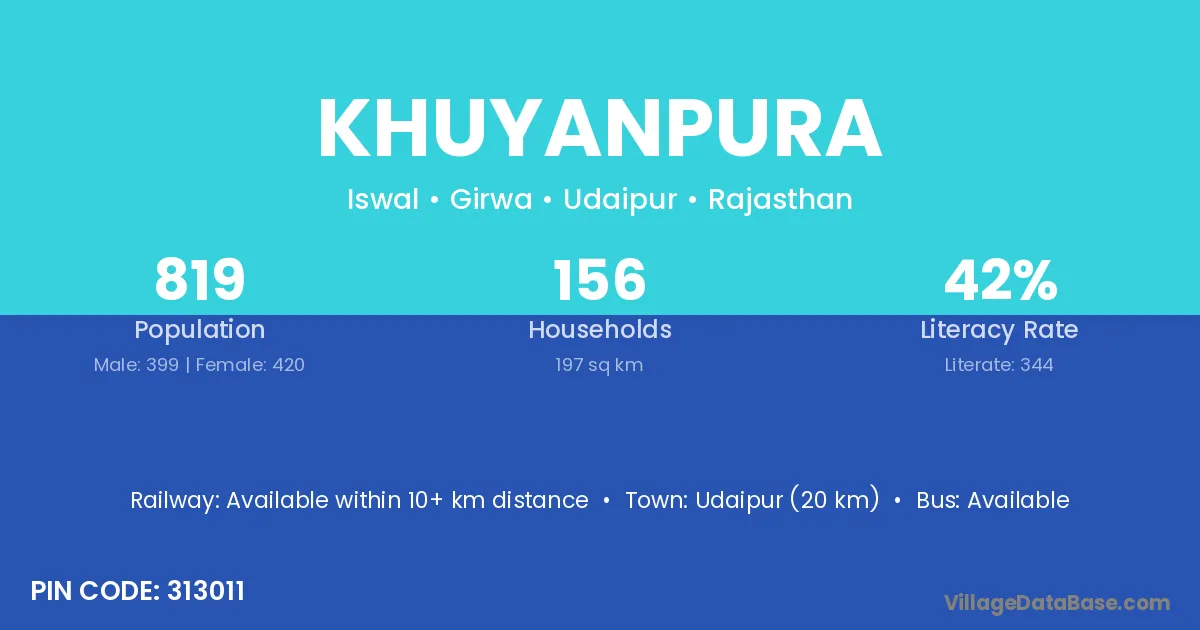 Udaipur (20 km) is the nearest town to Khuyanpura village for major economic activities and is located approximately 20 km away.