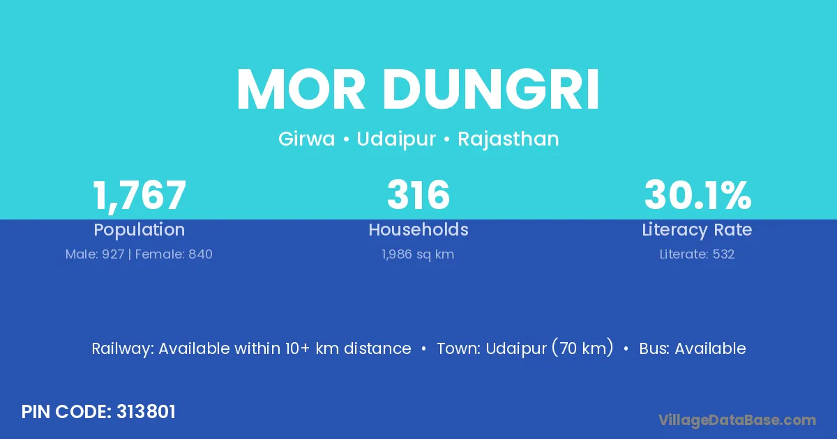 Udaipur (70 km) is the nearest town to Mor Dungri village for major economic activities and is located approximately 70 km away.