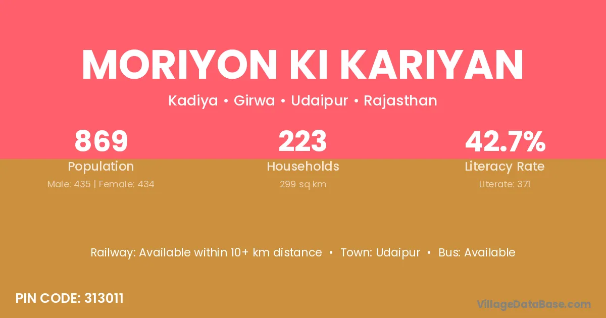 Moriyon Ki Kariyan village has a total population of 869 people, of which 435 are males and 434 are females.