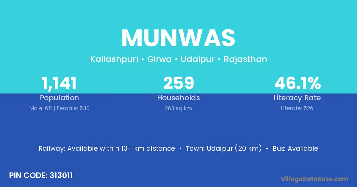 Udaipur (20 km) is the nearest town to Munwas village for major economic activities and is located approximately 20 km away.