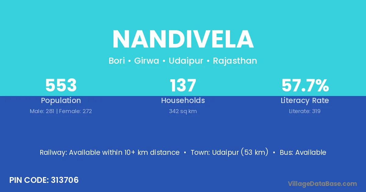 Udaipur (53 km) is the nearest town to Nandivela village for major economic activities and is located approximately 53 km away.