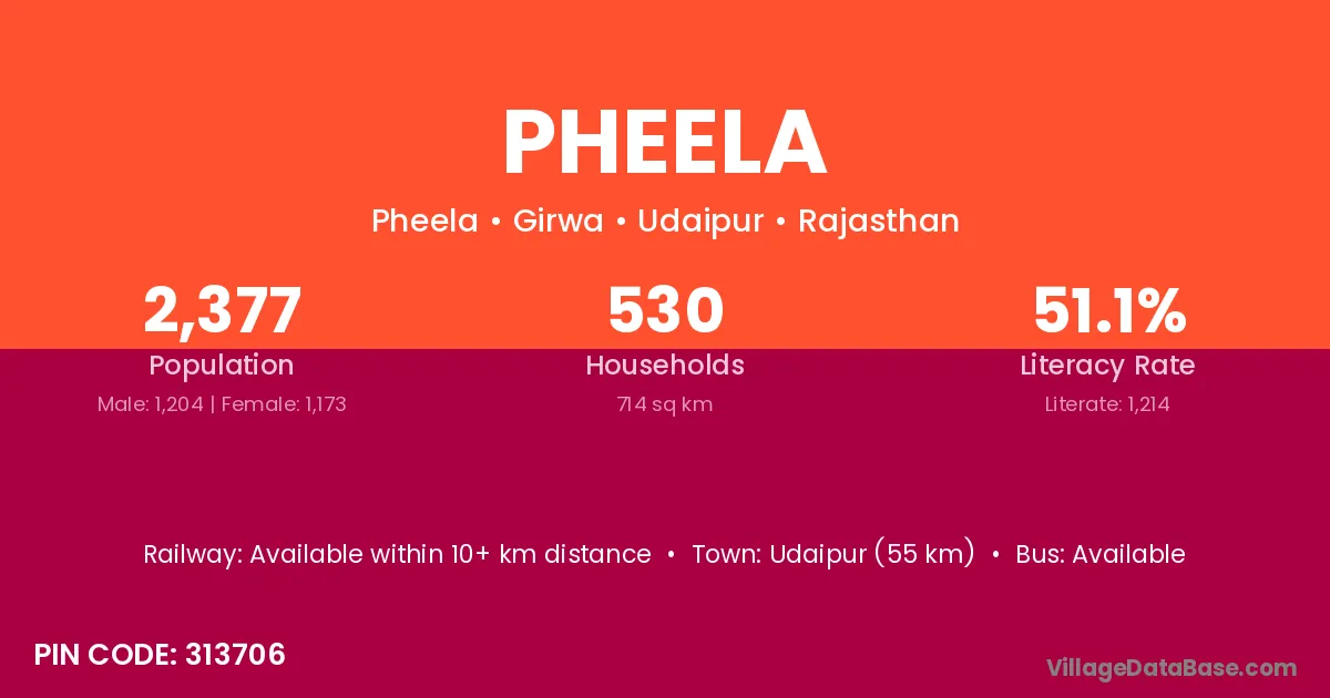 Udaipur (55 km) is the nearest town to Pheela village for major economic activities and is located approximately 55 km away.