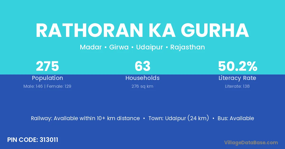 Udaipur (24 km) is the nearest town to Rathoran Ka Gurha village for major economic activities and is located approximately 24 km away.