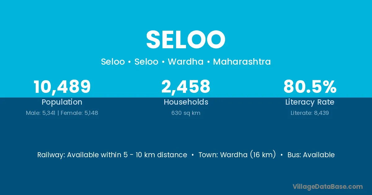 The literacy rate of Seloo village is 45.86%. Male literacy stands at 57.38% and female literacy at 32.99%.