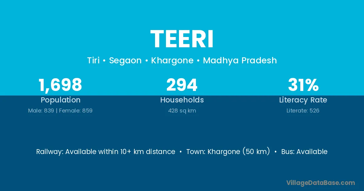 The literacy rate of Teeri village is 53.21%. Male literacy stands at 65.08% and female literacy at 40.04%.