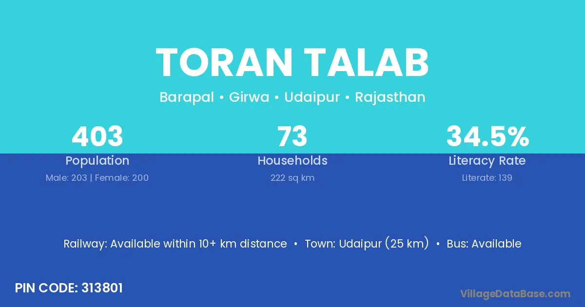 Udaipur (25 km) is the nearest town to Toran Talab village for major economic activities and is located approximately 25 km away.