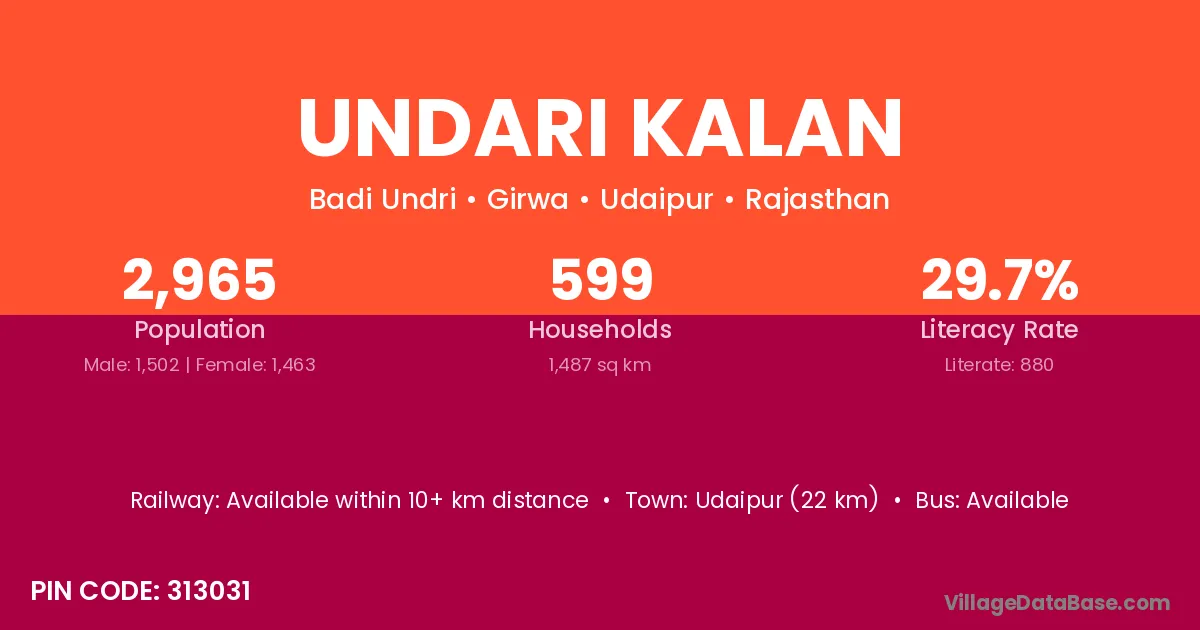 Udaipur (22 km) is the nearest town to Undari Kalan village for major economic activities and is located approximately 22 km away.