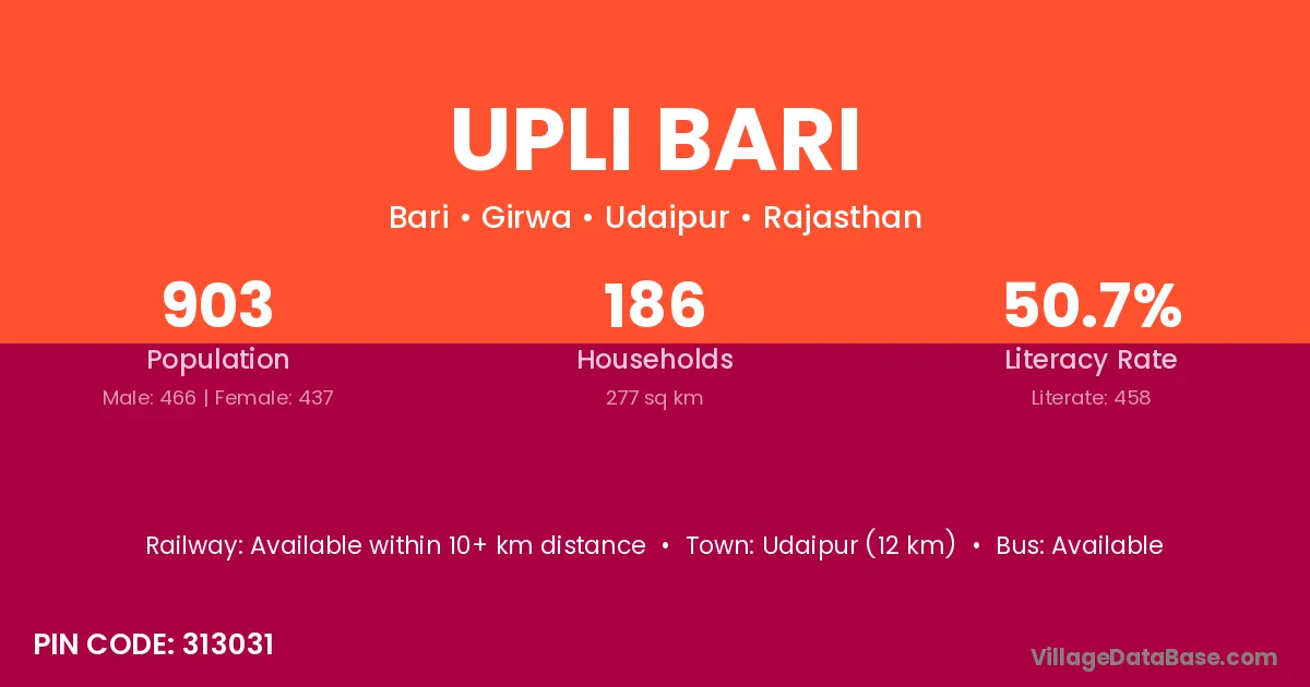 Upli Bari village has a total population of 903 people, of which 466 are males and 437 are females.