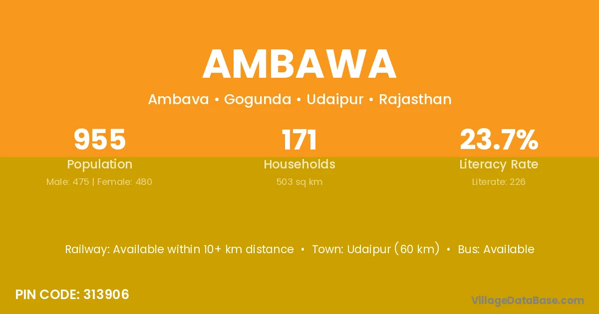 Udaipur (60 km) is the nearest town to Ambawa village for major economic activities and is located approximately 60 km away.