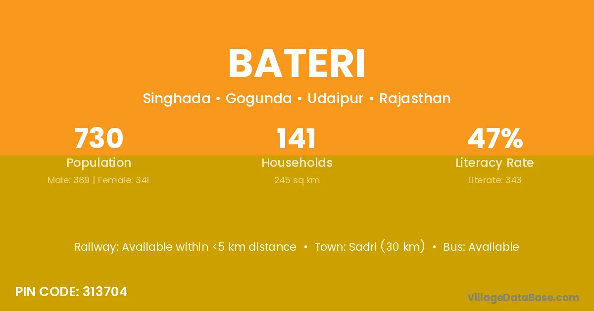 Sadri (30 km) is the nearest town to Bateri village for major economic activities and is located approximately 30 km away.