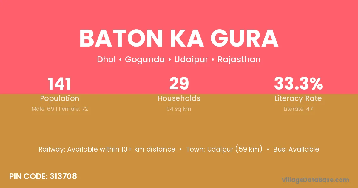 Baton Ka Gura village has a total population of 141 people, of which 69 are males and 72 are females.