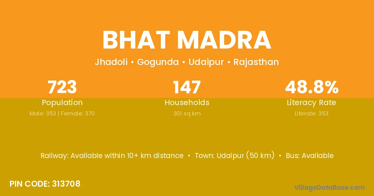 Bhat Madra village has a total population of 723 people, of which 353 are males and 370 are females.