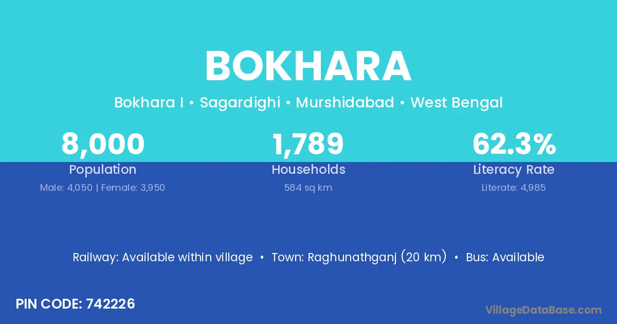 The literacy rate of Bokhara village is 27.20%. Male literacy stands at 38.17% and female literacy at 15.14%.