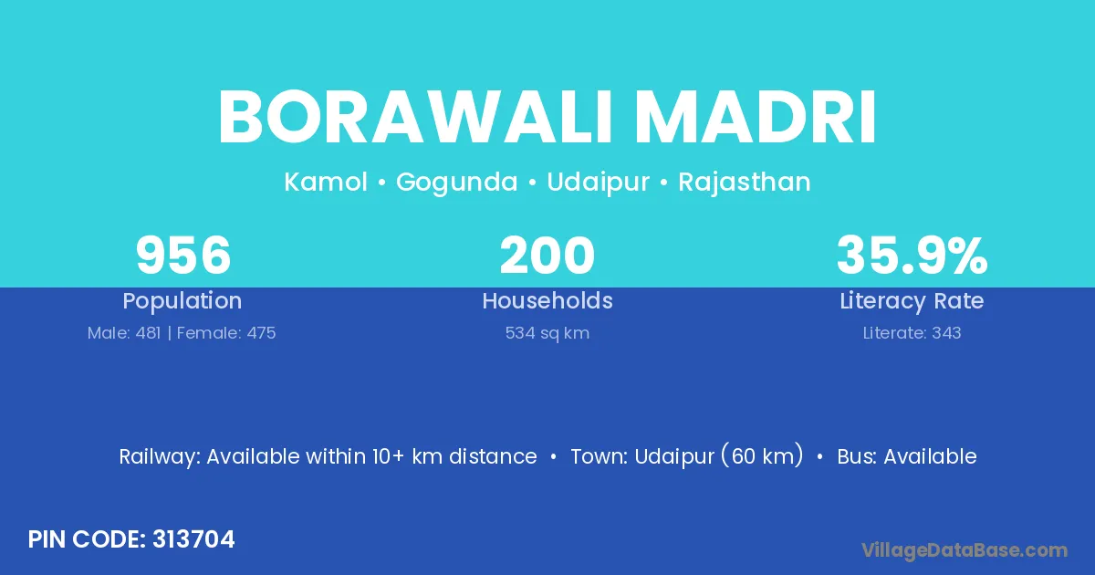 Udaipur (60 km) is the nearest town to Borawali Madri village for major economic activities and is located approximately 60 km away.