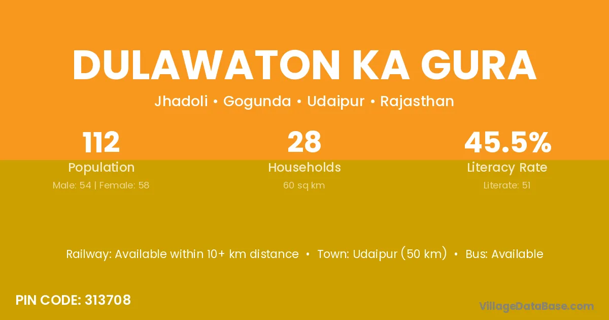 Udaipur (50 km) is the nearest town to Dulawaton Ka Gura village for major economic activities and is located approximately 50 km away.