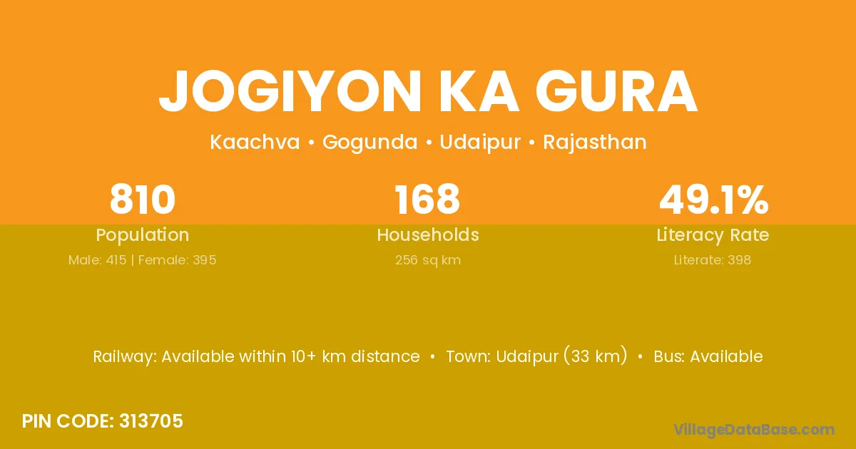 Jogiyon Ka Gura village has a total population of 810 people, of which 415 are males and 395 are females.