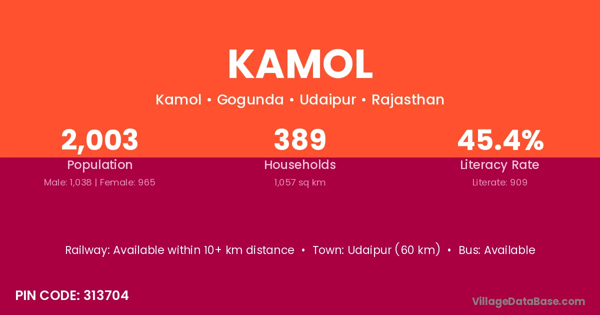 Udaipur (60 km) is the nearest town to Kamol village for major economic activities and is located approximately 60 km away.