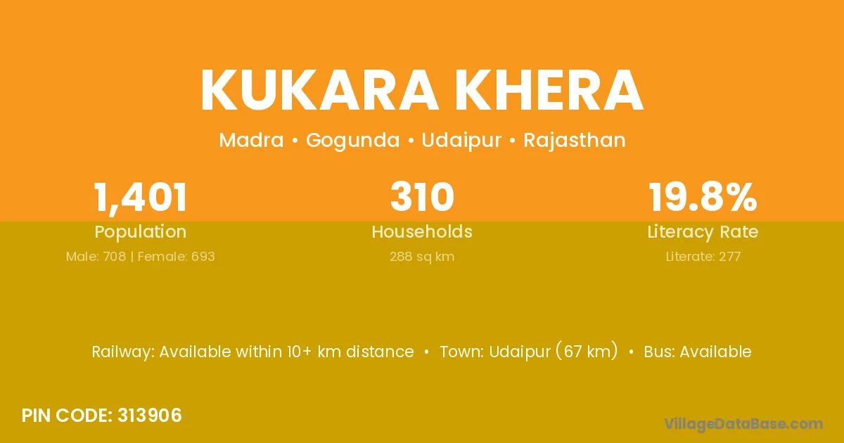 Udaipur (67 km) is the nearest town to Kukara Khera village for major economic activities and is located approximately 67 km away.