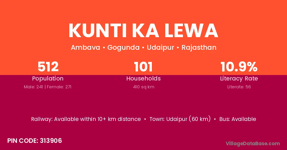 Kunti Ka Lewa village has a total population of 512 people, of which 241 are males and 271 are females.