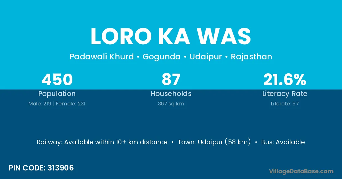 Udaipur (58 km) is the nearest town to Loro Ka Was village for major economic activities and is located approximately 58 km away.