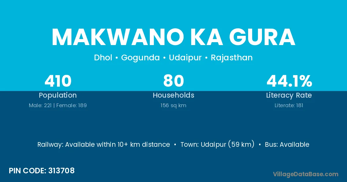 Udaipur (59 km) is the nearest town to Makwano Ka Gura village for major economic activities and is located approximately 59 km away.