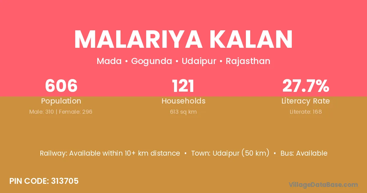 Udaipur (50 km) is the nearest town to Malariya Kalan village for major economic activities and is located approximately 50 km away.