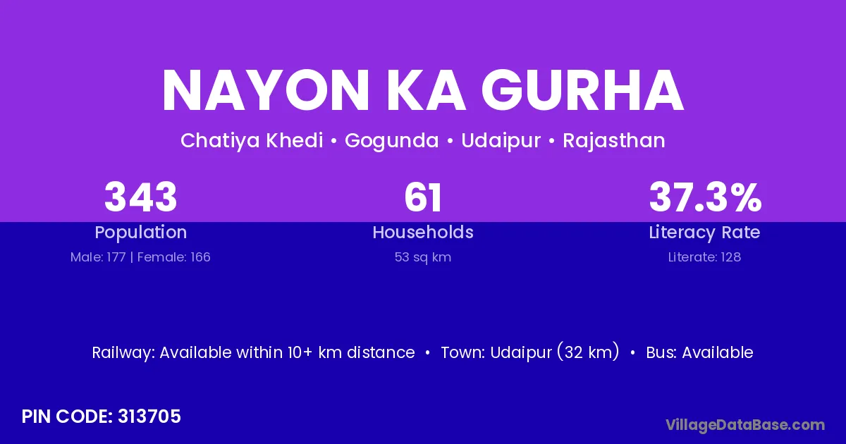 Udaipur (32 km) is the nearest town to Nayon Ka Gurha village for major economic activities and is located approximately 32 km away.