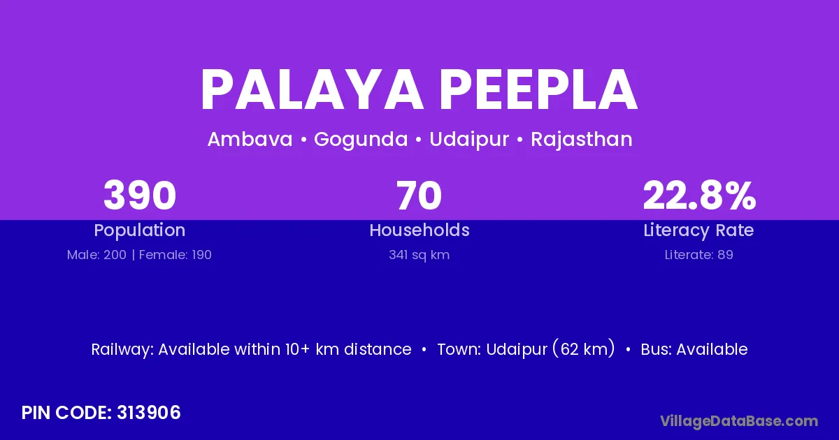 Udaipur (62 km) is the nearest town to Palaya Peepla village for major economic activities and is located approximately 62 km away.