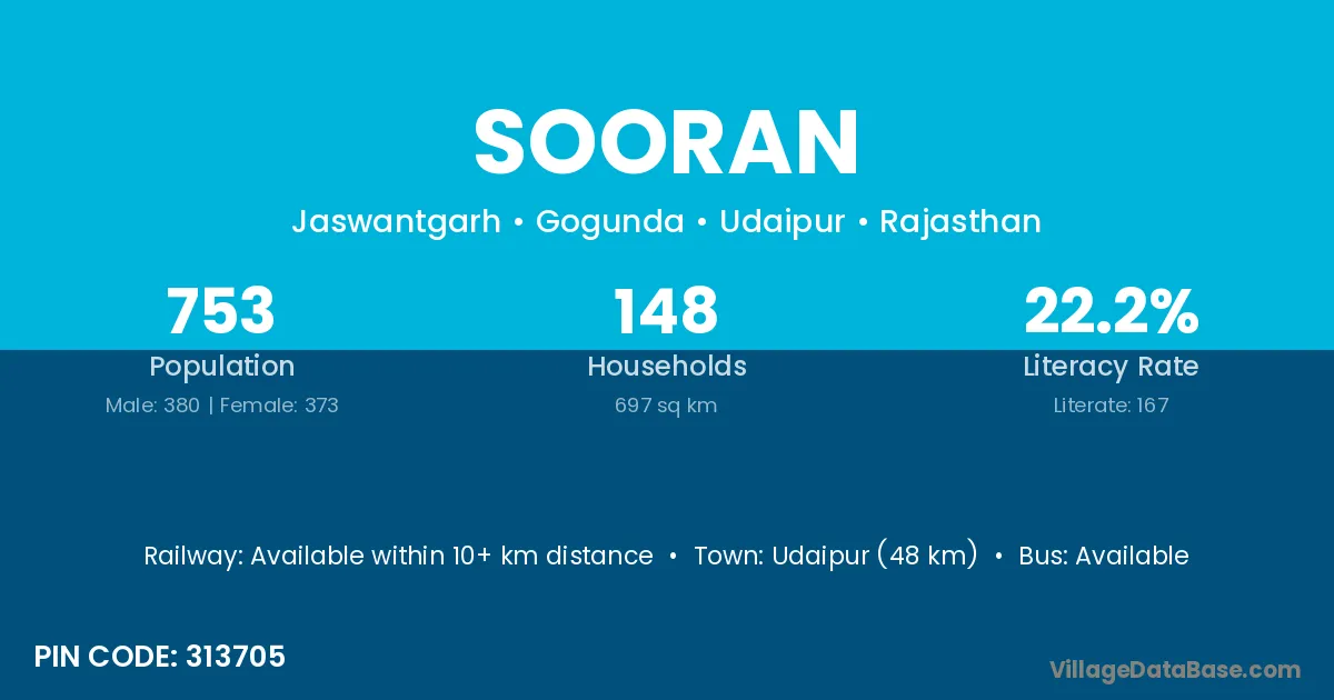 Udaipur (48 km) is the nearest town to Sooran village for major economic activities and is located approximately 48 km away.
