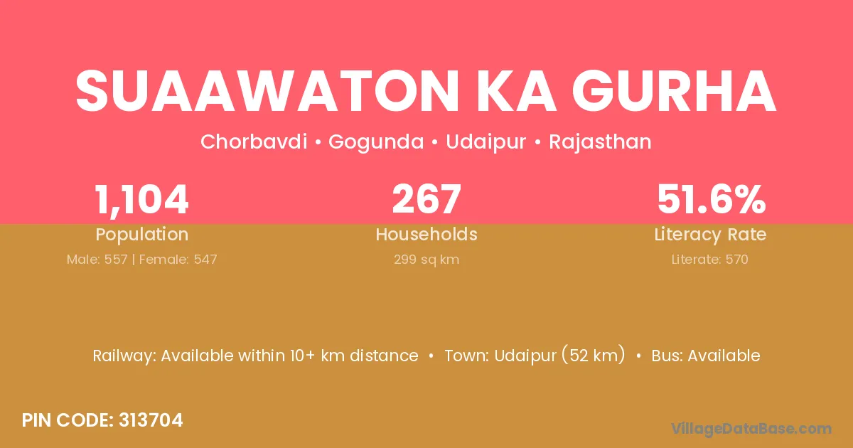 Suaawaton Ka Gurha village has a total population of 1,104 people, of which 557 are males and 547 are females.