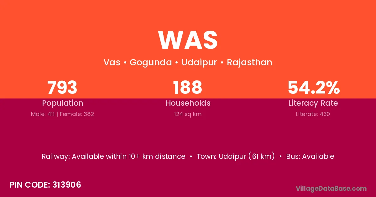 Udaipur (61 km) is the nearest town to Was village for major economic activities and is located approximately 61 km away.