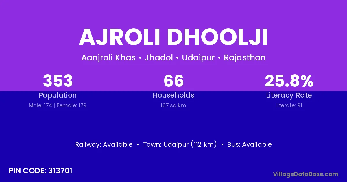 Ajroli Dhoolji village has a total population of 353 people, of which 174 are males and 179 are females.