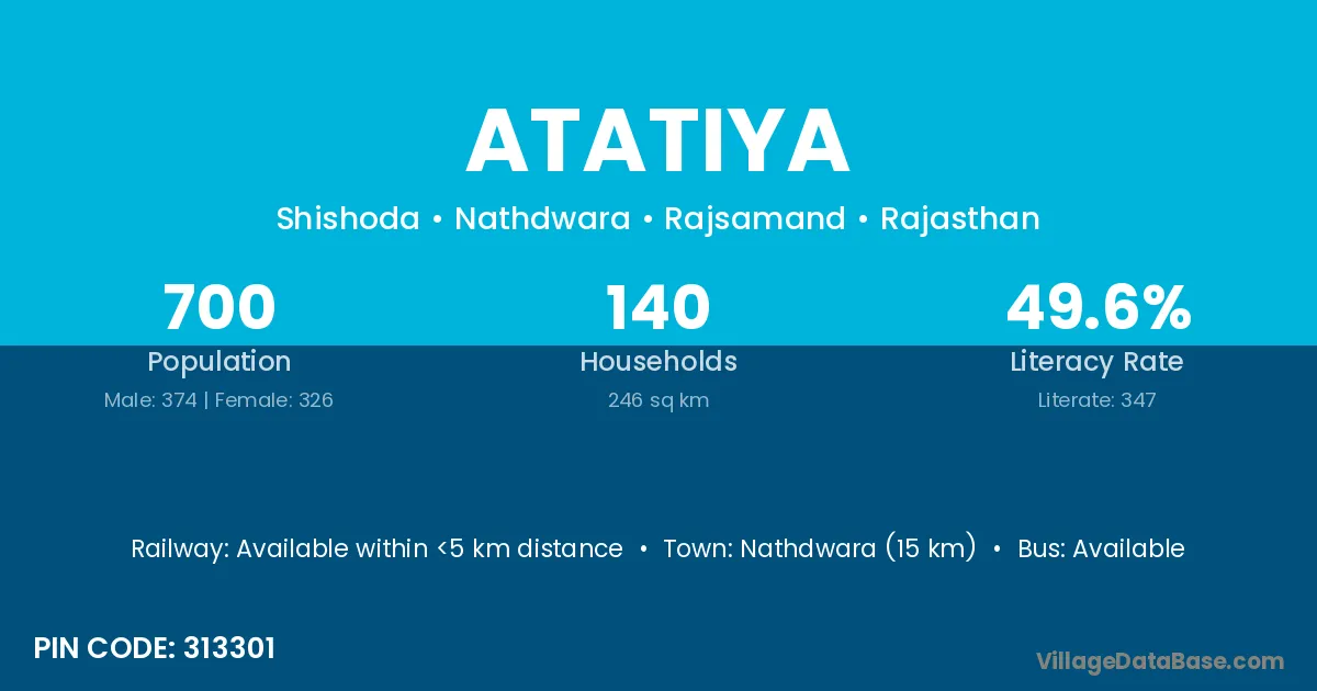 Udaipur (68 km) is the nearest town to Atatiya village for major economic activities and is located approximately 68 km away.