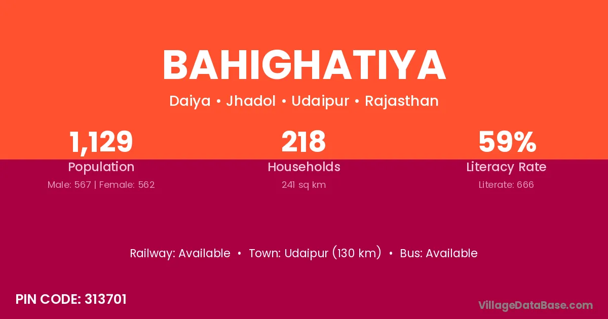 Udaipur (130 km) is the nearest town to Bahighatiya village for major economic activities and is located approximately 130 km away.