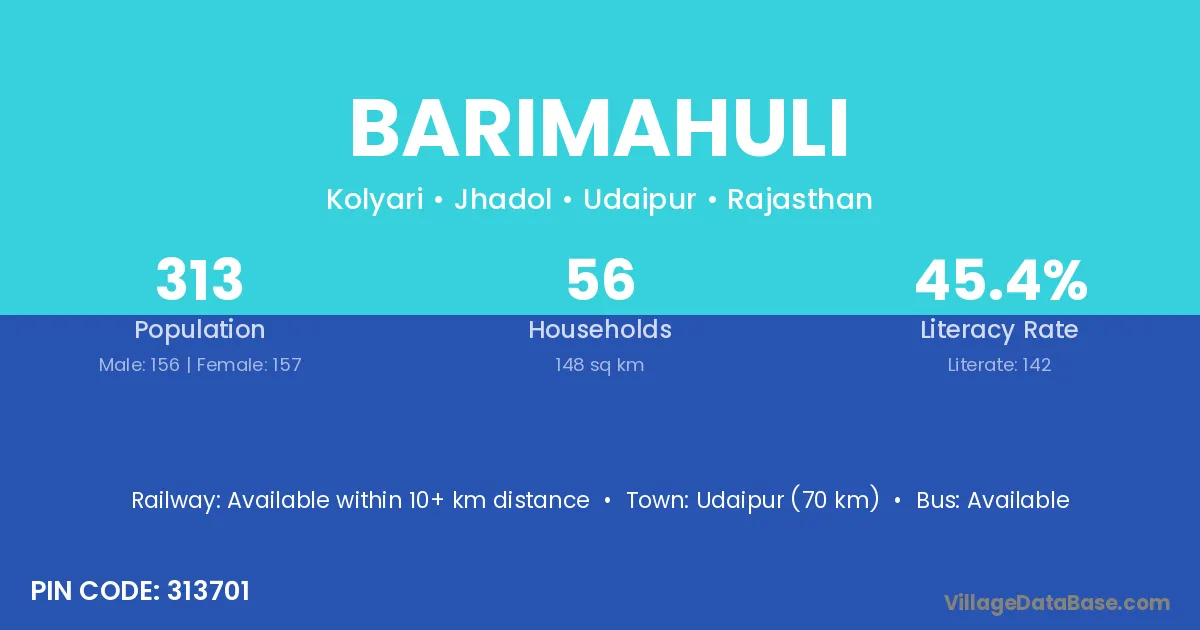 Barimahuli village has a total population of 313 people, of which 156 are males and 157 are females.