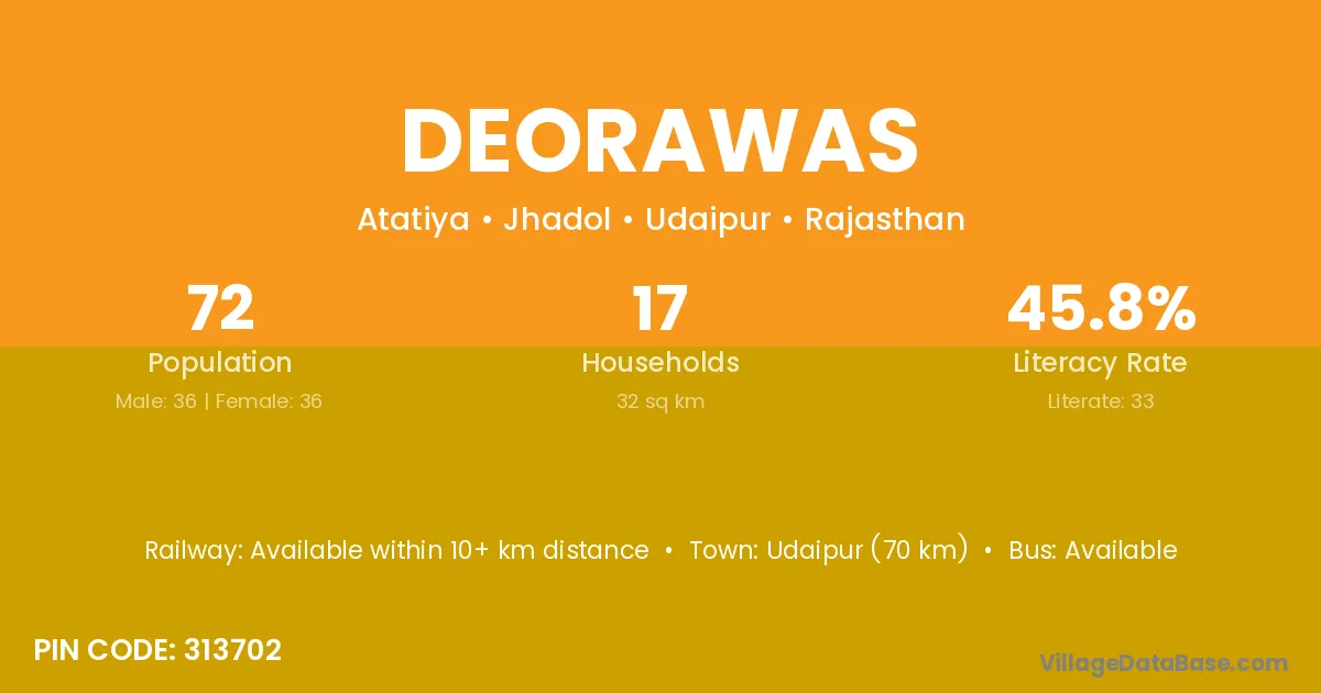 Udaipur (70 km) is the nearest town to Deorawas village for major economic activities and is located approximately 70 km away.