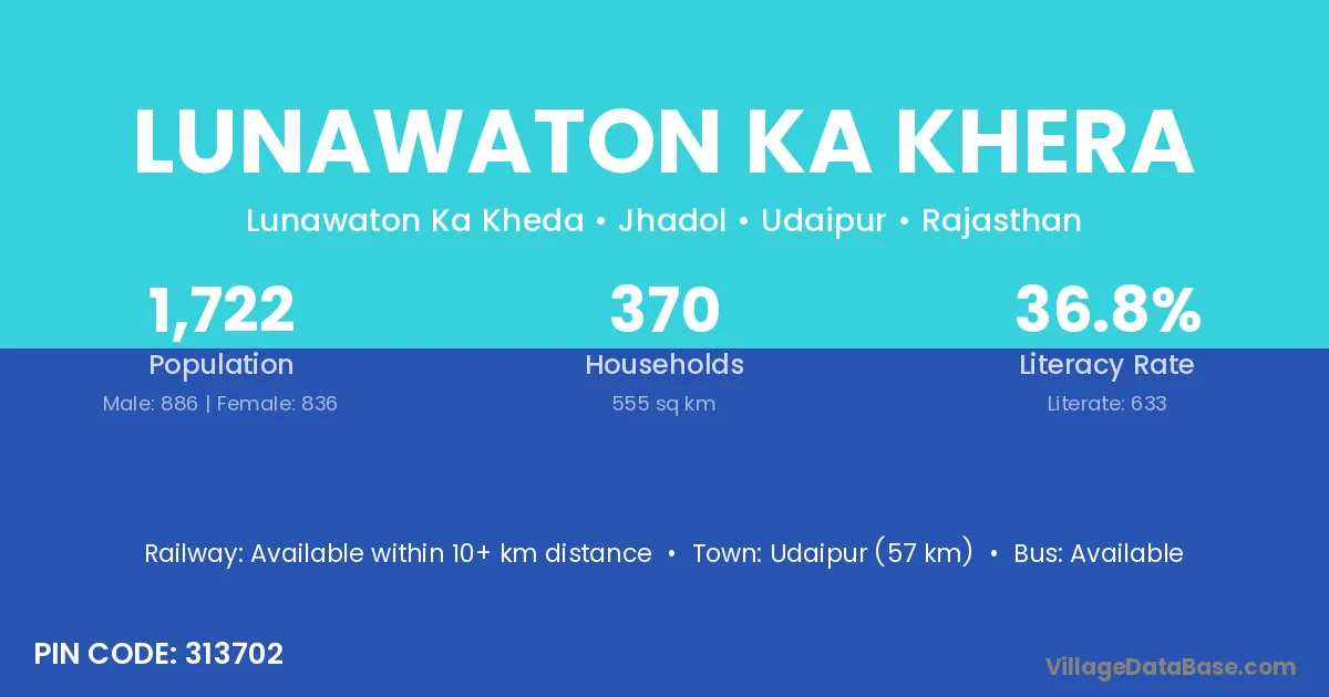Udaipur (57 km) is the nearest town to Lunawaton Ka Khera village for major economic activities and is located approximately 57 km away.